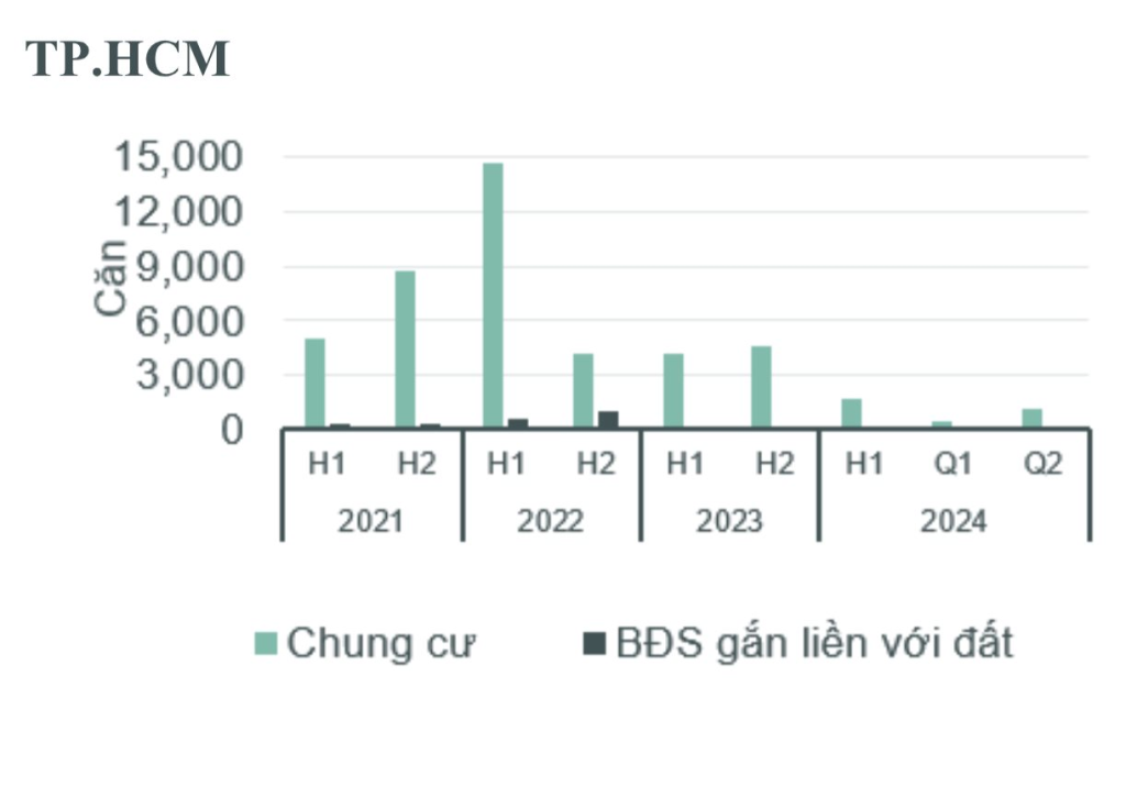 Trong quý 2/2024, nguồn cung căn hộ chung cư mới tại TP. HCM còn hạn chế, chỉ bằng 40% nguồn cung mới của cùng kỳ năm trước. Số lượng căn hộ bán được trong 6 tháng đầu năm đạt 80% so với cùng kỳ năm trước.