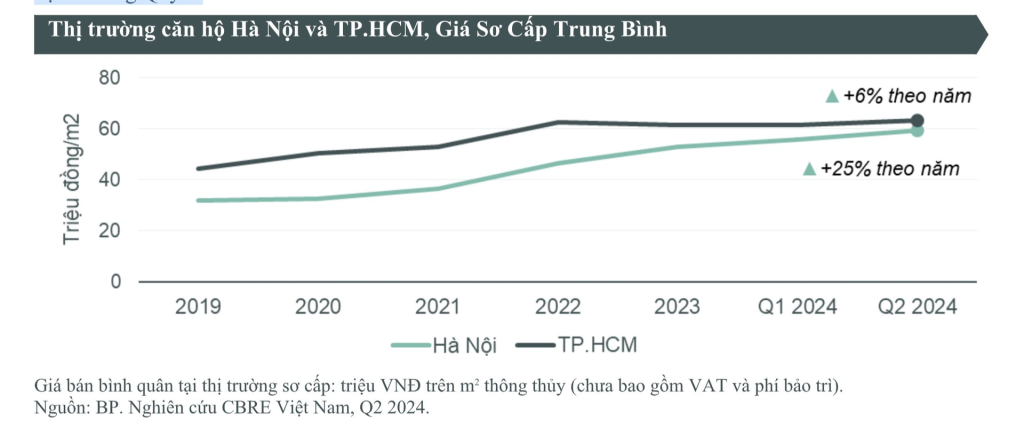 Theo CBRE, do nguồn cung khan hiếm nên giá bán trên thị trường sơ cấp TP. HCM tiếp tục đà tăng nhẹ, tăng khoảng 3% theo quý và 6% theo năm, đạt trên 63 triệu đồng/m2. Ở thị trường thứ cấp, giá chung cư cũng tăng 4% theo quý, và 3% theo năm. Mức tăng này nhờ các thông tin tốt về tiến độ dự án và tiến độ hoàn thiện hạ tầng xung quanh khu vực.