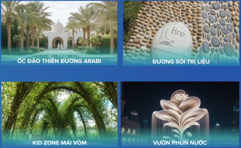 • Ốc đảo thiên đường Arabi: Không gian thiên nhiên tuyệt đẹp với phong cách Arabi, được bố trí thành một ốc đảo riêng biệt, mang lại cảm giác thư thái và mới lạ cho du khách.