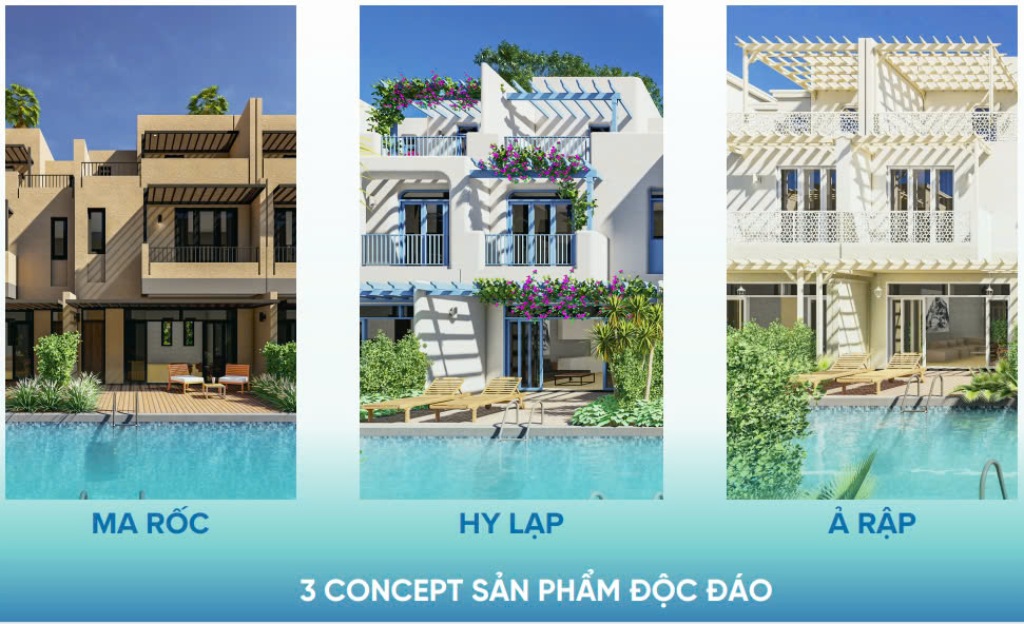 • Khu Hy Lạp (18,5 ha – 685 căn Townhouse): Phong cách ven biển Hy Lạp với thiết kế thanh lịch, màu sắc tươi sáng, đưa cư dân về một không gian phóng khoáng và yên bình bên bờ biển.
