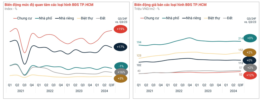 Báo cáo quý 3/2024 của Batdongsan.com.vn cũng dẫn chứng. Thị trường bất động sản đã xuất hiện dấu hiệu đảo chiều, mức độ quan tâm có xu hướng tăng. Trong đó, mức độ quan tâm chung cư tăng 24% trong quý 3. Tại Tp.HCM, giá căn hộ trung bình dao động từ 45 đến 130 triệu đồng/m2. Tỷ lệ hấp thụ của các dự án mở bán mới từ mức trung bình (30% – 60%) đến mức rất tốt (>80%).