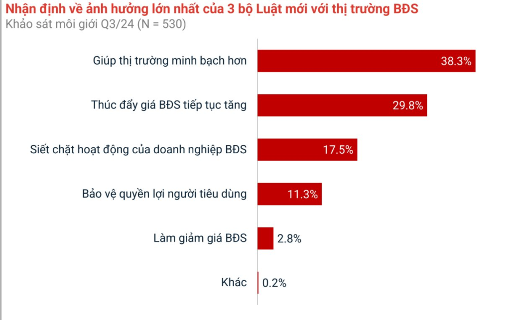 Theo ông David Jackson, các chi phí liên quan đến đất đai, vốn phát triển dự án dự báo tăng hơn nữa khi Luật Đất đai 2024 (sửa đổi), Luật Nhà ở, Luật Kinh doanh bất động sản có thông tư, hướng dẫn áp dụng. Bài toán cân đối nguồn vốn để phát triển dự án cũng sẽ phức tạp hơn khi luật mới quy định mức đặt cọc không quá 5% tổng giá trị bất động sản. Vì vậy, giá bất động sản khó giảm trong ngắn hạn.