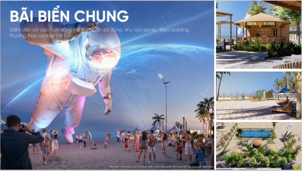 Bãi biển chung là điểm đến lý tưởng cho những ai yêu thích các hoạt động thể thao biển sôi động như lướt sóng, dù lượn, mô tô nước… Du khách có thể thỏa sức khám phá đại dương bao la, tận hưởng cảm giác mạnh và thư giãn tuyệt đối. Bên cạnh đó, khu vực picnic và team building được thiết kế hiện đại, không gian thoải mái, đáp ứng nhu cầu tổ chức các sự kiện ngoài trời của các nhóm bạn, gia đình và công ty.